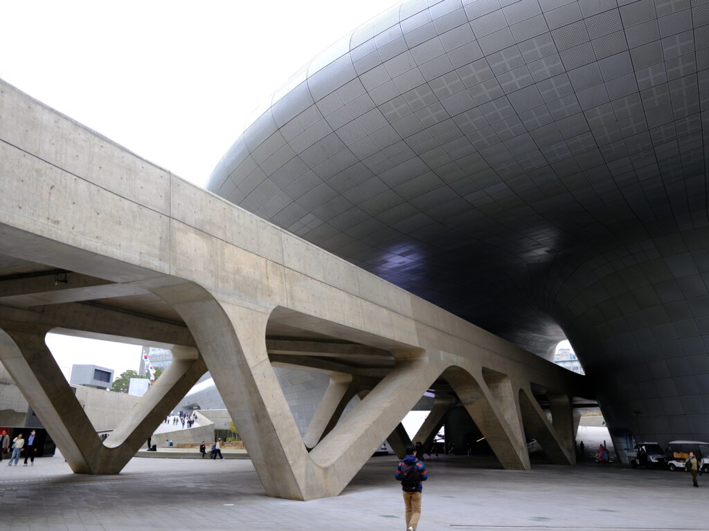 たまたま降りた東大門で異様なフォルムの建物を目にしました。これは東大門デザインプラザ(DDP)というデザインミュージアム併設のイベント会場。後で調べたら新国立競技場のデザインで話題になったあのザハ・ハディドの手によるものでした。彼女はその奇抜なデザインから”Queen of the Unbuilt”と呼ばれていましたが、こうやって実現した壮大な建築物を現地で目にすると、これは確かに実際に建てるのは大変だわ、と感じました。余談ですが、最近の日本の建築物は保守的すぎると思っています。例えば梅田のスカイビル(凱旋門のような門の形をした有名なビルですね)のようなアイコニックな建物が少なく、後世に残るモニュメントが不足している。地震などの要因があるのかもしれませんが、建築物を発注する施主の腰が引けている気がしますね。このDDPは一見の価値ありです。
